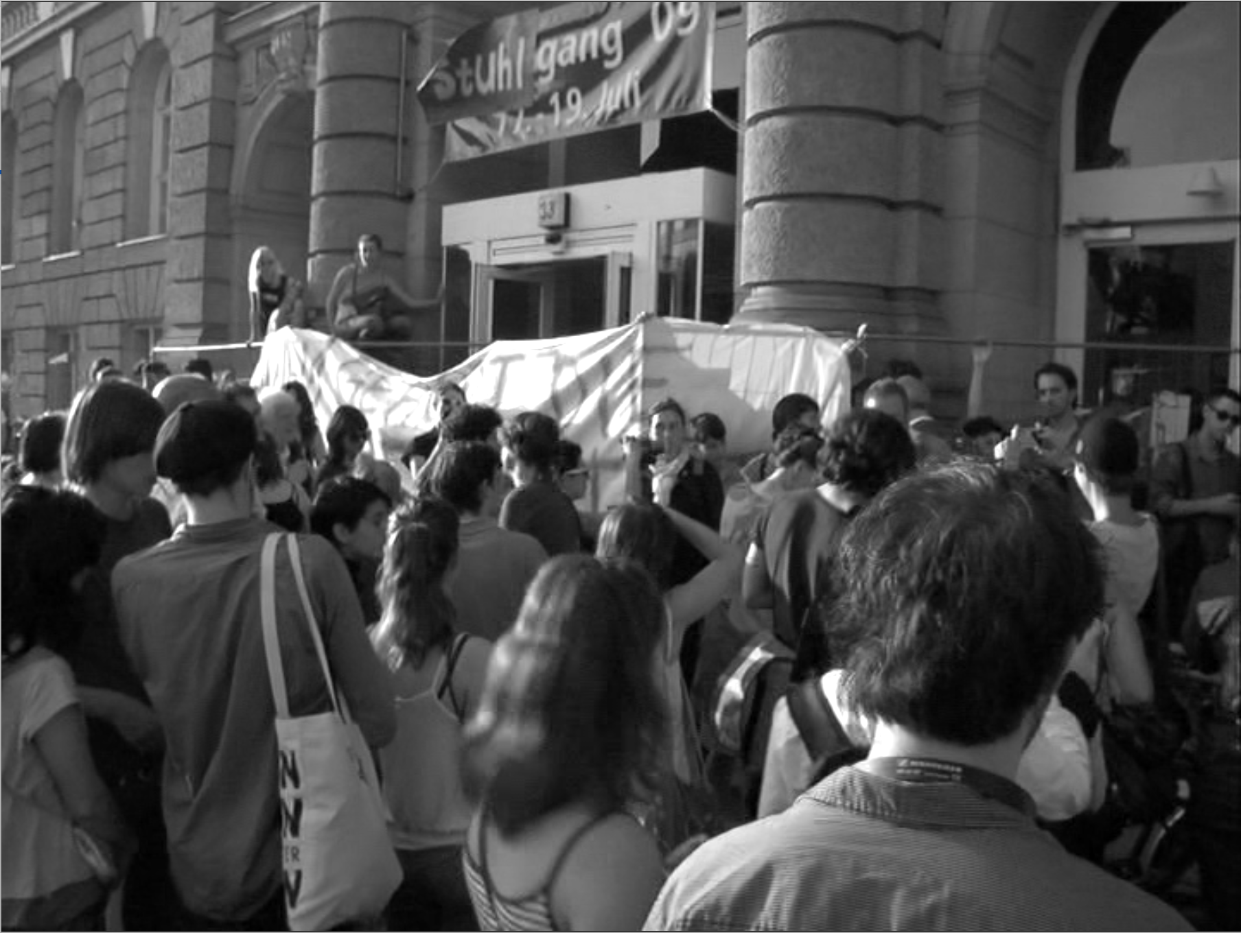 A filmic collage of documentary material from past generations of strikes and interviews with those involved at the time. What were and are the reasons for protest and strike at the HdK/UdK? What was the situation in 1988/89 out of which the student organization Interflugs was founded? The half-hour documentary combines the historical with the current - the protests of students during the 2009 end of year show.