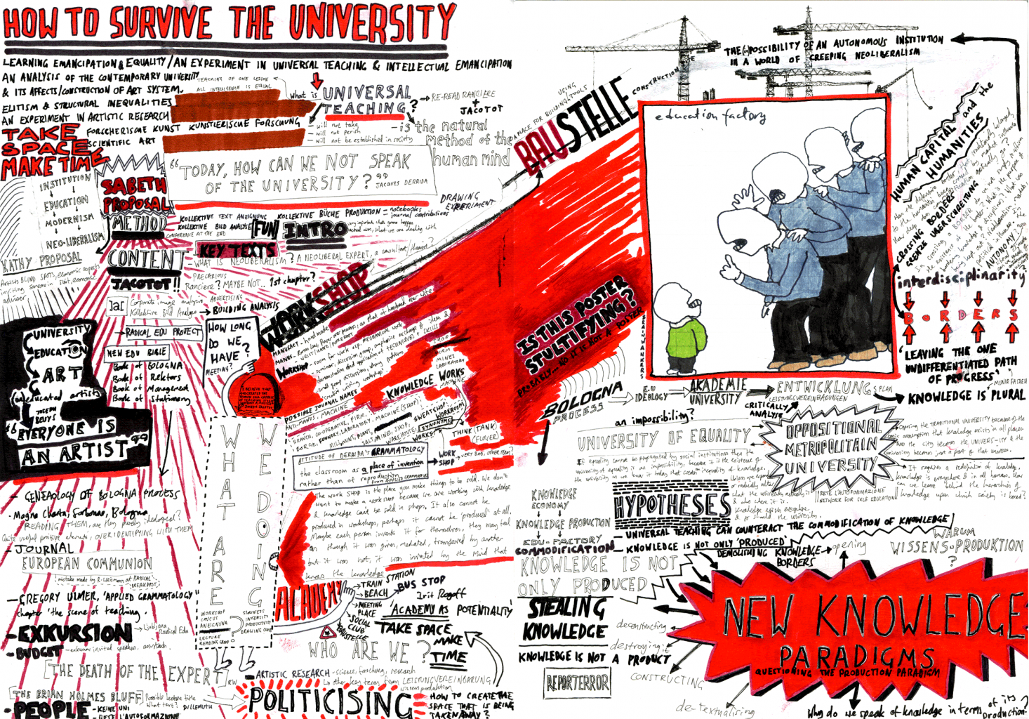 DEU: Das Temporäre Institut entstand im Rahmen der Academy of Refusal - einer Besetzung der Kunstakademie in Wien im Oktober 2009, die Teil der Hochschulbesetzungsbewegung "Unibrennt" war. Das Institut war Teil des Versuchs einer oppositionellen urbanen Universität/Gewerkschaft; die Kehrseite von Hochglanzanzeigen, Broschüren und Marketingkampagnen; eine Manifestation der unsichtbaren gespenstischen Arbeit, die durch jede soziale Institution fließt, sie erschafft und ihr einen Wert verleiht; und es ist dieser Geist, der kollektiv in der Lage ist zu lernen, zu organisieren und zu handeln.